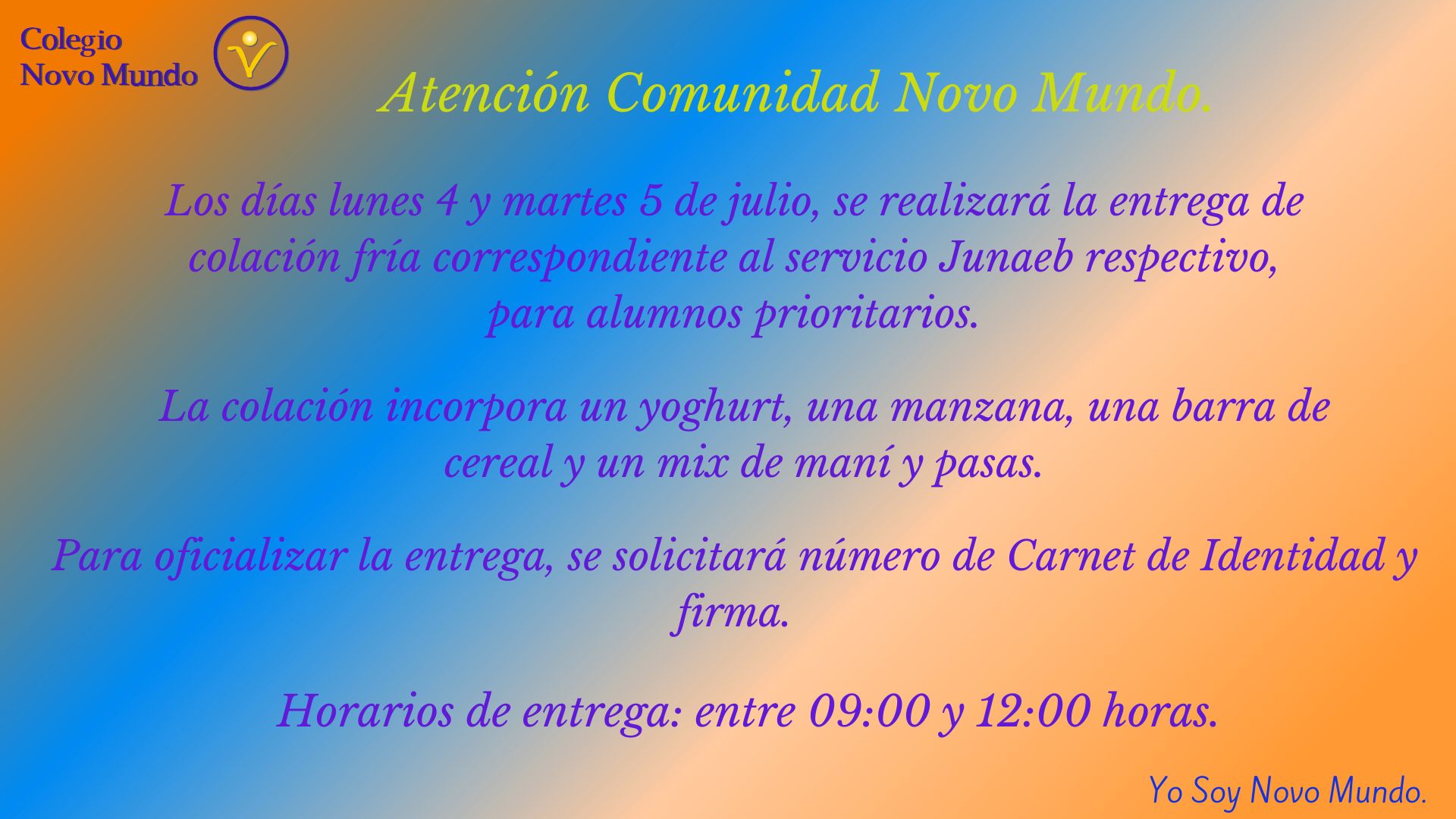 - ATENCIÓN COMUNIDAD NOVO MUNDO. POR RAZONES DE FUERZA MAYOR, EL RETIRO DE ESTUDIANTES JORNADA MAÑANA LUNES 9 DE JUNIO, A PARTIR DE LAS 14:00 HORAS.