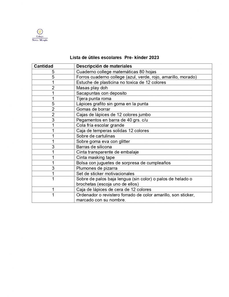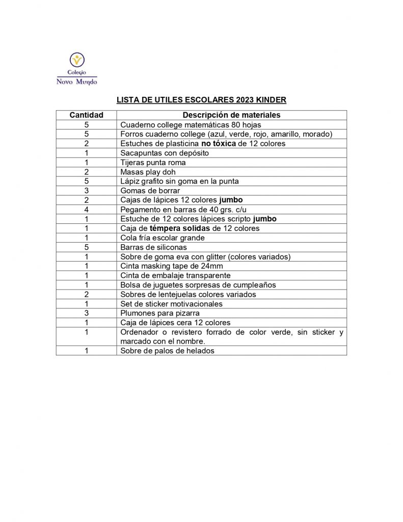 Lista de útiles escolares Prekinder 2023 LISTA DE UTILES ESCOLARES 2023 KINDER Salas 2023002
