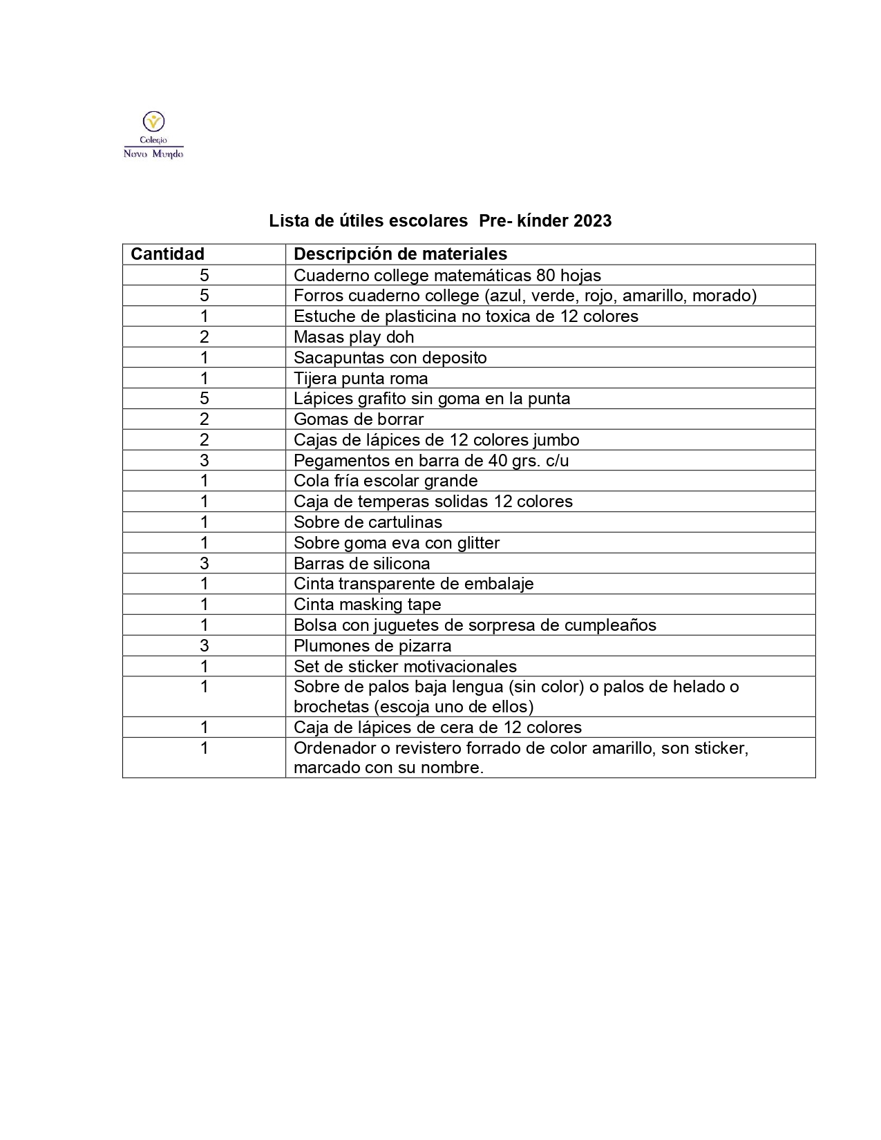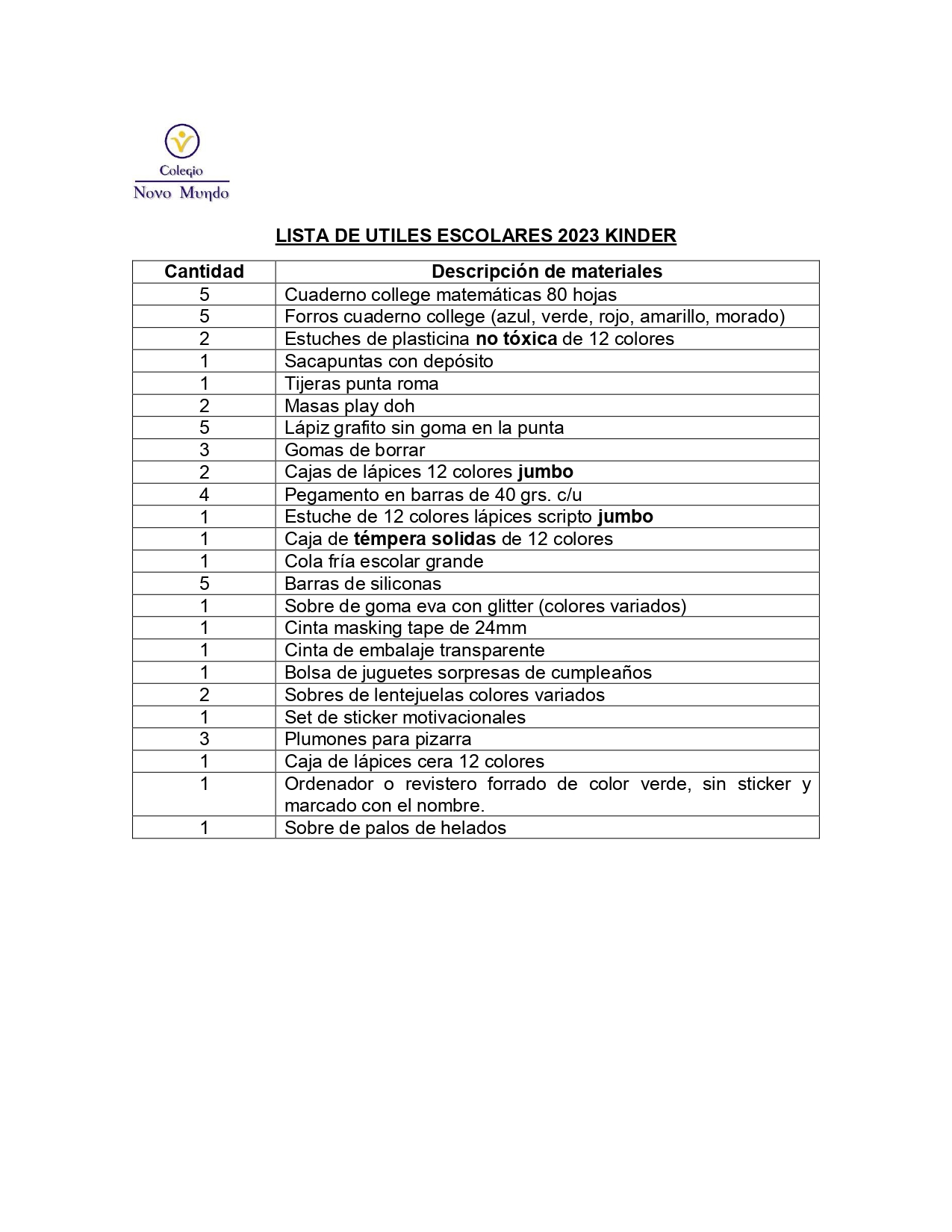 LISTAS DE ÚTILES ESCOLARES PARA PRE KÍNDER Y KÍNDER. DISPOSICIÓN DE SALAS DE CLASES Y OFICINAS COMUNIDAD NOVO MUNDO.